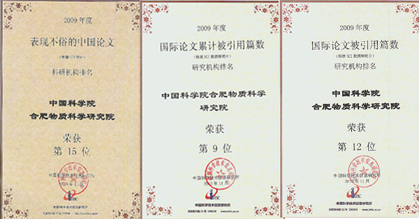合肥研究院2000-2009年发表的SCI收录论文累计被引用1670篇,被引用次数17227次,篇均引用次数达到10.32次,远高于全国平均水平5.87次,位居全国研究机构第9名,与去年相同。2009年度发表的SCI收录论文被引用291篇,被引用次数939次,居全国研究机构第12名。