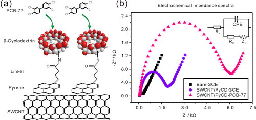 SWCNTsPyCD有机复合物(a) 修饰电极组装过程;(b) 复合物修饰电极对多氯联苯的电化学阻抗谱