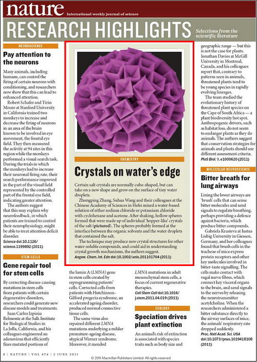 近来,中科院合肥物质科学研究院智能所张忠平研究员和王素华研究员领衔的研究团队在著名的国际化学期刊《德国应用化学》(Angew. Chem. Int. Ed)上发表了有关发现食盐新结晶形态的论文。该项工作引起了国内外化学科研工作者及国际著名期刊的广泛关注。6月2号出版的最新一期《自然》(Nature)杂志,在其报道重要研究进展的“研究亮点新闻”栏目中,以“水边缘的晶体”(Crystals on water’s edge)为题刊发了这一化学领域的研究新成果,并配以大幅照片(Nature, 474, 8, doi:10.1038/474008a)。这也是智能所的科研工作第一次引起《自然》杂志的关注和报道。
