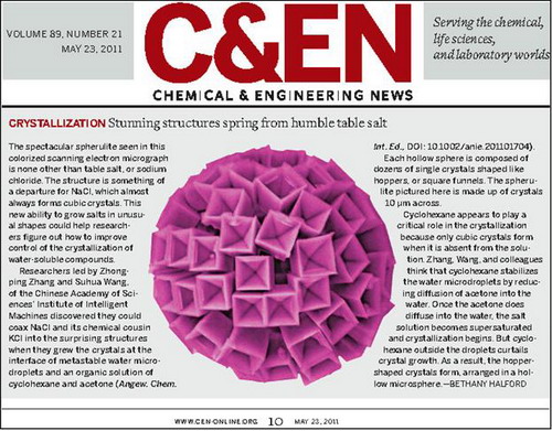 5月23日,专门报道化学及化工领域重要进展的美国化学会期刊《化学与工程新闻》(Chemical & Engineering News)也以“令人惊讶的晶体结构从餐桌上的食盐开始”(Crystallization: stunning structures spring from humble table salt)为题专题报道了该研究工作,并给予了高度评价(http://pubs.acs.org/cen/news/89/i21/8921notw7.html)。