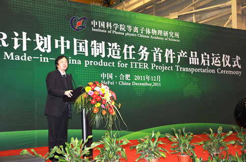 12月2日,合肥研究院等离子体所为国际热核聚变实验堆(ITER)计划中国制造任务研制的首件产品“ITER环向场(TF)超导导体”举办交付启运仪式。科技部副部长曹健林、ITER总干事 Motojima、中国国际核聚变能源计划执行中心(ITER中心)副主任罗德隆、中科院基础局黄敏副局长、安徽省科技厅厅长徐根应、合肥研究院院长王英俭、ITER中心有关领导以及该产品生产合作企业代表等出席仪式。