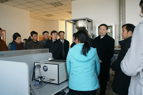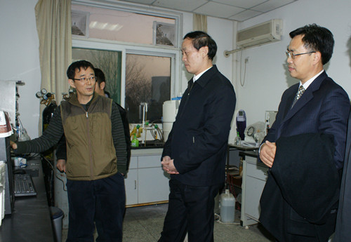 余欣荣一行首先来到智能所智能信息系统研究中心智能决策实验室,现场查看了实验室近红外土壤肥力传感器、激光诱导击穿光谱土壤重金属与肥力传感器、谷物流量与土壤电导率传感器等设备,现场观看了该实验室研发的农业搜索引擎——“中国搜农”的应用演示。科研人员详细汇报了该实验室在土壤PH值、土壤中氮、磷、钾、重金属检测方面的研究进展以及取得的成效,余欣荣认真倾听并与现场科研人员深入交流。