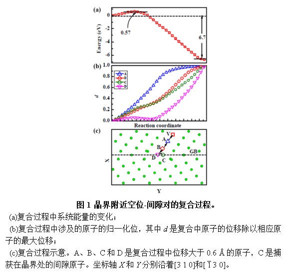 钨及其合金中的辐照损伤问题是聚变研究中的重要问题之一。辐照诱导的微观缺陷不仅会使材料性能降级,还会改变H/He在基体材料中的滞留等行为。近年来的研究表明,纳米晶和纳米级氧化物弥散增强的材料通常能降低辐照缺陷在基体中的累积,从而表现出较佳的抗辐照损伤性能。然而,其微观机制尚不清楚。固体所研究人员使用分子动力学和静态计算方法,考察了晶界在修复纳米结构钨中辐照损伤方面扮演的能量学和动力学角色。研究发现,在辐照过程中,相对于空位而言,间隙原子被晶界优先吸收,从而在级联碰撞冷却后形成晶界附近富含空位而晶界内部间隙高度局域的缺陷结构。晶界通过降低其附近空位/间隙的形成能和扩散能垒而作为缺陷阱,特别是间隙在晶界附近不需要克服能垒即可迁入晶界。优先进入晶界内的间隙可与附近的空位以低能垒、多原子协同参与的方式复合(图1)。同时研究人员发现,晶界增强空位扩散、复合的区域较为有限(1-1.5纳米),使得该区域体积分数较小(几个百分点)。这表明实验上提高钨基材料抗辐照性能的两种途径——细化钨晶粒和加入纳米小颗粒——后者可能更为有效。相关研究结果发表在《核聚变》(Nuclear Fusion, 2013, 53, 123014)杂志上。