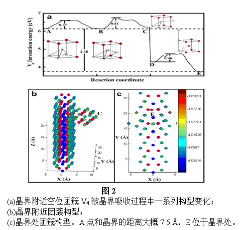 针对候选结构材料——铁素体/马氏体钢的辐照损伤问题,科研人员使用分子动力学、静态计算和温度加速的动力学方法,考察了晶界附近小型空位团簇的能量学和动力学行为。研究表明:晶界除了作为点缺陷(空位和间隙)的阱外,还可以作为小型空位团簇(所含空位数1-9)的阱。空位团簇在晶界附近具有较高的活性。其经过块体扩散、局部吸收和局部沿晶扩散过程而被晶界吸收(图2)。相关研究结果发表在《核材料》(Journal of Nuclear Materials, 2013, 440, 250-256)杂志上。