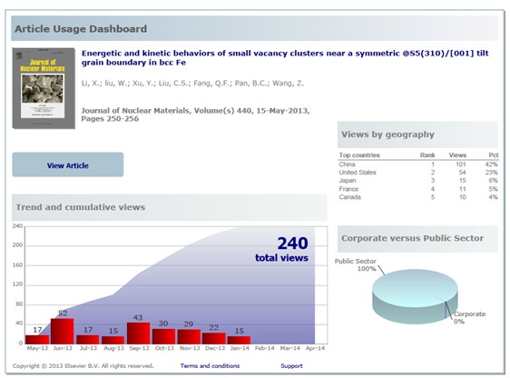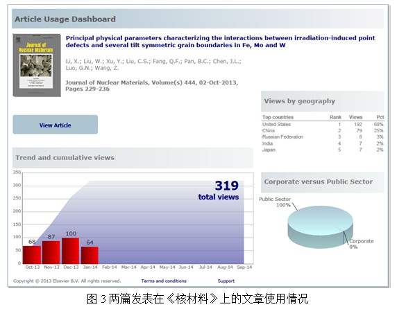 为了深入考察晶界对辐照缺陷产生和演化的影响,科研人员使用静态计算系统考察了钨、钼、铁等金属中部分晶界附近空位/间隙的扩散复合问题,获得了晶界与缺陷作用的一系列参数:缺陷形成能,偏聚能,扩散-复合能垒,以及相应的作用范围。这些参数为分析材料的抗辐照性能和设计新的高性能抗辐照材料提供了重要的基础数据。相关研究结果发表在《核材料》(Journal of Nuclear Materials, 2014, 444, 229-236)杂志上。文章发表后受到国内外同行们的关注(参见艾斯维尔科技期刊Elsevier Science & Technology Journals近期提供的文章使用情况图Article Usage Dashboard,图3)。
