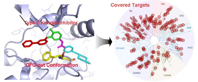 激酶当前被认为是抗肿瘤最重要的药物开发靶点之一,自2001年以来,美国食品药品监督管理局已经批准了23个靶向激酶的抗肿瘤药物。目前以激酶为靶点的药物按照它们结合位点的不同主要可以分为I型, II 型及III型三大类,其中I型类最为常见,主要靶向于活化状态的激酶;II型主要靶向于非活化状态(DFG-out)。自经典的II型药物格列维(Gleevec)上市后,针对此类药物的开发成为一个热点方向。根据结构分析,传统观点认为II型药物比I型药物特异性强,选择性更好。但是长久以来, II型药物是否比I型药物具有更高的选择性,有哪些激酶可以被II型的激酶药物打击一直是从事药物开发的科研人员高度关注的关键科学问题,但此前还未有详细系统的研究。