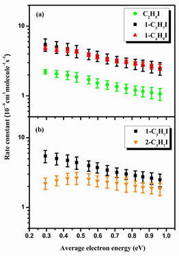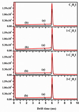 电子-分子相互作用是辐射生物、等离子体化学、气体激光中的基本过程。在载能电子作用下,分子不但可以转化为正离子,而且也能形成负离子;通常,电子碰撞产生负离子的实验研究都要求在真空或低气压下完成。光谱质谱研究室科研人员将紫外光电离电子源与离子迁移谱技术相结合,发展的PI-EA-IMS技术能够在大气压条件下研究电子诱导反应,并以碘代烷烃为例,通过离子迁移谱的测量,获得了负离子产率与电子能量之间的关系。这是光谱质谱室发展的第三种电子俘获离子迁移谱技术,在此之前,光谱质谱室还发展了大气压氮气电晕放电电子俘获离子迁移谱APNCD-EA-IMS以及基于光电效应的光电辐射电子俘获离子迁移谱PE-EA-IMS技术,都成功地用于卤代烷烃的低能电子诱导反应动力学研究。