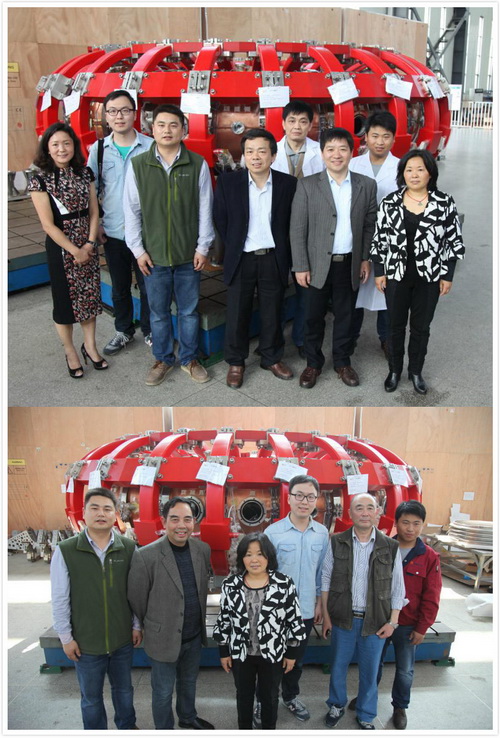 中国科学技术大学刘万东教授,等离子体所万宝年所长、李建刚研究员、宋云涛常务副所长、张平研究员,项目负责人杨庆喜副研究员、郑金星助理研究员、工程师徐皓、张午权、陈肇玺和科烨公司董事长吴信莲及公司其他工程师等现场见证了KTX装置主机中极向场磁体线圈、导体壳、反馈控制线圈及纵场(TF)线圈等关键部件的现场装配与双“C”结构真空室合开工程调试。