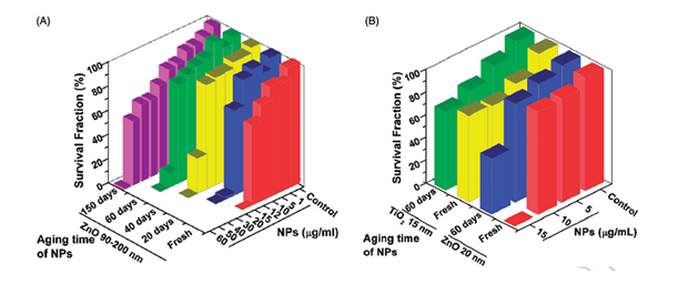 新鲜和老化纳米氧化锌(90-200nm, A; 20nm, B)和纳米二氧化钛(15nm, B)对AL细胞存活率的影响