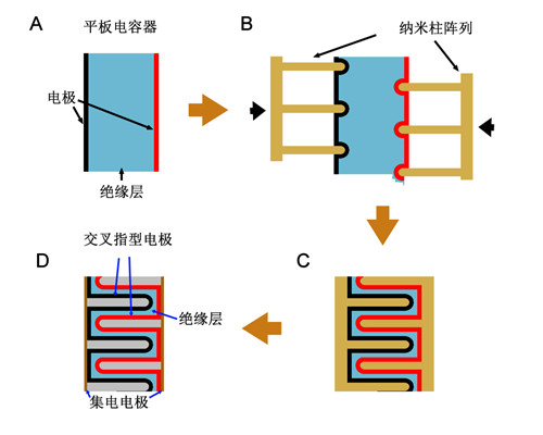 最近,固体所科研人员与宋礼教授及魏秉庆教授合作,巧妙地设计了一种具有三维结构叉指纳米电极的电介质电容器。他们的设计思路如图1所示,图1A为普通的平板电容器,将两对纳米柱阵列从电容器的两个平板相对插入,如图1B所示。在该过程中,假设两个电极板和位于其中间的介电层都能无限的供应材料且不破碎,则随着两对纳米柱阵列的插入,最终可形成三维结构交叉指形电极(图1C),然后去掉纳米柱阵列,则形成了具有叉指电极的电介质电容器(图1D)。在相同的宏观(表观)电极面积上,实际比表面积将大大增加,从而将大幅度提高电荷存储能力。