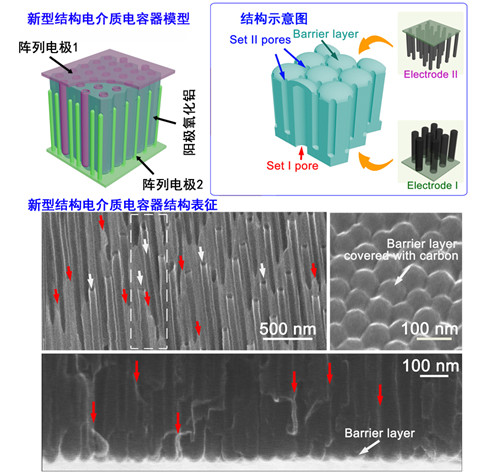 这种新型结构的电介质电容器,两对电极均具有极大的比表面积,能有效存储大量电荷;电介层是通过阳极氧化铝自发形成的均匀厚度的孔壁及圆弧形的障碍层,确保了电容器具有很高的击穿电压,这些有利因素叠加起来,大幅度提高了电介质电容器的电荷存储能力,试验发现该电容器能量密度可达到2 Wh/kg,这是目前所有报道中的最高值。这种新型结构电介质电容器,有望作为电源或混合动力源,用于高功率或需要较高能量密度的相关领域。
