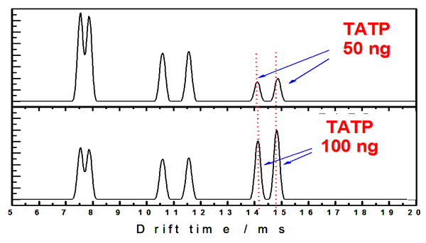 医学物理中心光谱质谱研究室早在2008年就研制出了非放射源离子迁移谱爆炸物探测仪,不但可以检测常规硝基炸药,而且能检测自制炸药TATP;最近,研制的新一代离子迁移谱爆炸物探测仪,已通过了高低温、高温高湿、震动冲击、放电试验、电磁兼容、软件测评、性能对比等第三方的测试,将为公共安全面临的挑战提供先进的技术支撑。此外,光谱质谱研究室在2008年将质子转移反应质谱PTR-MS(Proton transfer reaction mass spectrometry)率先用于炸药的探测,也实现了对痕量炸药TATP的快速检测。