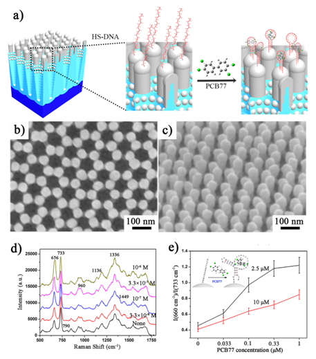 课题组研究人员把银纳米柱阵列的高SERS活性、均匀性、信号可重复性及适配体的特异性吸附的优点结合起来,将能够与PCB-77特异性结合的DNA适配体修饰到银纳米柱阵列的表面,PCB-77分子与适配体结合引起DNA结构的变化,从而导致DNA的拉曼光谱也发生相对应的变化,通过检测DNA适配体表面增强拉曼光谱信号的变化,实现免标记定量检测PCB-77。实验结果显示,衬底的表面增强拉曼光谱敏感性随着所修饰适配体浓度的降低而增加,通过对比656cm-1(鸟嘌呤的呼吸振动峰)和733cm-1(腺嘌呤的呼吸振动峰)的拉曼强度的比值变化实现了对纯水、自然湖水中PCB-77的定量化的检测,检测极限(达3.3×10-8M)比一般的Ag纳米柱阵列的检测极限降低了约3个数量级,也是目前获得测量PCB-77灵敏度最高的表面增强拉曼光谱检测方法。同时,这项工作为特异性检测环境中痕量持久性有机污染物提供了新的方法和依据。