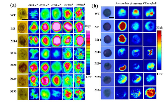 图2:雨生红球藻培养20天后不同突变株的(a)红外光谱显微成像分析图和(b)拉曼光谱显微成像分析图
