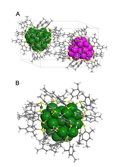 图1. Au44(2,4-DMBT)26纳米团簇的晶体结构[2](图1A为一个晶胞中的一对对映异构体;图1B为放大的一个异构体)。