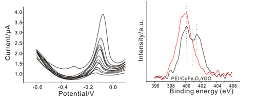 研究人员在前期工作(Electrochimica Acta 185 (2015) 52–61)基础上,期望对一种离子实现特异性检测。通过氨基功能化CoFe2O4/Graphene复合物,借助SEM、XRD、FTIR、XPS等对材料进行光谱表征,构建电极材料。石墨烯与磁性材料形成复合物而增强其导电性,采用氨基(聚乙烯亚胺和乙二胺)功能化复合材料增强其选择性,从而大幅度实现材料选择性及检测灵敏度的双重提高。电化学分析表明,材料和离子之间作用是吸附过程,通过对复合物材料与重金属离子作用前后的XPS分析,进一步明确了金属离子与电极材料的作用方式为吸附控制过程。同时,对土壤中重金属铜离子分析检测取得良好效果。