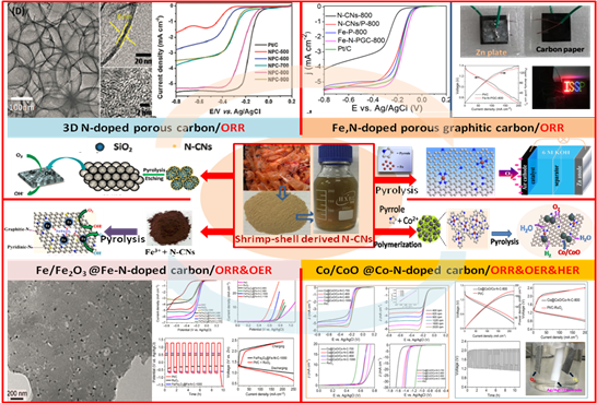图1 以虾壳为原料制备碳基电催化剂的流程,相应电镜表征和ORR/OER/HER催化活性,Zn-空电池性能及应用实例。