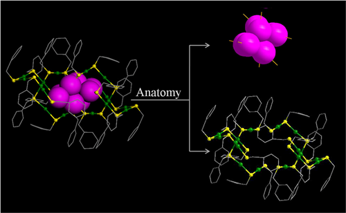 图3. Au24(以Au24(SCH2Ph)20为例)团簇的结构特征:内锁的长钉(右下)及与配体充分键合的内核(右上) (部分来自Angew. Chem. Int. Ed. 2016, 55, 11567 -11571)。