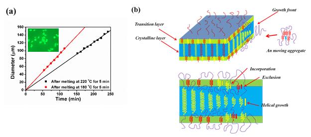 图一(a)球晶在中间相熔体和去除热历史熔体的生长过程,(b)聚丙烯中间相结晶模型。 |