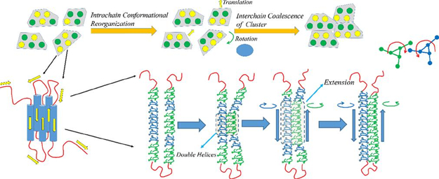 研究人员利用傅里叶红外、宽角和小角X射线散射研究了中间相到α相的转化过程。发现形成由相反手性组成的双螺旋和链滑移是相转变的两个必备条件。当双螺旋形成时,链滑移带动不同手性的螺旋向相反方向运动,导致整个链的构象重组(如图二),这一模型有利于理解近年来发现的有关聚丙烯中间相的现象。