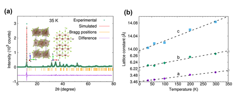 图:(a)WTe1.98在温度35K的X射线衍射谱;(b)WTe1.98的晶格参数随温度的变化。