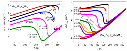 反钙钛矿结构化合物ANMn3(A=Ag、Ga、Zn等)在反铁磁-顺磁相变时产生晶格体积的陡然收缩,即磁容积效应(Magnetovolume effect, MVE)。前人的研究表明,利用Ge、Sn等非磁性元素部分地替代A位,可将MVE的温度窗口展宽,获得负膨胀。然而该方法在展宽NTE温区的同时也使之向高温移动,难以有效地调控NTE温度窗口,特别是无法获得面向低温领域的NTE材料。该课题组林建超博士、博士生郭新格等从ANMn3中反铁磁序的阻挫特性出发,选择具有不同MVE温度的母体化合物,利用Mn元素部分地替代A位元素,引入与反铁磁相竞争的铁磁序,扰动并且延缓反铁磁序的有序化进程,展宽了MVE温度窗口,获得了多个面向不同温区的NTE新材料。该研究对于精确调控反钙钛矿结构NTE材料的工作温区、探索基于磁容积效应的新型NTE材料具有指导意义。相关研究结果发表于Scripta Mater. 128, 74-77 (2017)、Appl. Phys. Lett. 106, 082405 (2015)和Appl. Phys. Lett. 107, 202406 (2015)。