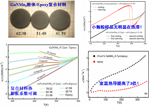 最近,该课题组林建超博士以前期研制的细颗粒GaNMn3粉体为填充剂,制备出均匀性好、孔隙率低的GaNMn3/环氧树脂复合材料。此类复合材料的膨胀系数可调,介电性能和热导率较环氧树脂有显著提升。作为一种热固性材料,环氧树脂具有较低的固化温度且易于加工成型,被广泛应用于电子、航天、汽车以及休闲等领域。然而环氧树脂具有大的热膨胀系数(室温下αL=40-80 ppm/K),远大于常见金属和陶瓷材料(αL通常小于20 ppm/K)。此外,环氧树脂导热性能差、抗热震能力弱。这些热学特性严重地制约了环氧树脂的实际应用。GaNMn3/环氧树脂复合材料较纯环氧树脂具有更广阔的应用空间,特别是在下一代的嵌入式电容器领域有着重要应用前景。相关研究结果发表于复合材料领域著名刊物Comp. Sci. Tech. 146, 177-182 (2017)。