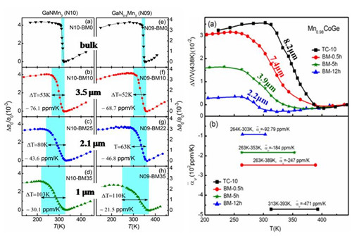 图2、GaNMn3(a)和MnCoGe(b)微米颗粒中颗粒大小对负膨胀的调控。