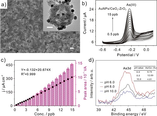 在此基础上,课题组博士生杨猛利用~10nm的Au纳米颗粒修饰的分级多孔CeO2-ZrO2纳米球(Au/CeO2-ZrO2)作为电极材料,利用分级多孔CeO2-ZrO2纳米球对砷的吸附(J.Hazard.Mater. 2013, 260, 498)作用,详细研究了在不同的pH的介质中对As(III)检测。同时,研究人员利用X-射线光电子能谱(XPS)技术探究了pH8.0条件下获得优异的电化学性能的原因。X-射线光电子能谱实验结果定量的表明在接近实际水环境pH的介质中(pH8.0),Au/CeO2-ZrO2纳米复合材料对As(III)具有更大的吸附容量,从而在Au纳米颗粒表面有更多的As(III)发生氧化还原反应,因此获得增强的溶出信号。所提出的分析方法已用来检测内蒙古托克托县官地营村地下水中的As(III),并获得准确的检测结果与满意的回收率,表明该分析方法具有检测实际水样中污染物As(III)的应用潜力。