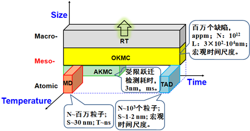 图1. 纳米晶辐照损伤效应跨尺度模拟软件中主要模块时间和空间尺度范围。