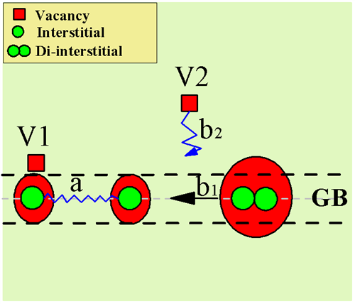课题组科研人员利用自主开发的上述软件,模拟分析了钨纳米晶中自间隙原子及其团簇复合空位的动态图像。钨及其合金是制备核聚变堆偏滤器部件及面向等离子体材料的候选材料。在聚变堆中,这些部件和材料须承受14MeV的中子辐照和10MWm-2的热流。辐照会在钨纳米晶中产生由平行的一维线性原子串构成的自间隙原子团簇缺陷。辐照诱导的缺陷会在基体中累积,不仅造成钨的力学性能降级,还会导致钨中氢/氚的滞留增多。通过引入缺陷阱(如晶界)可与辐照缺陷相互作用,使辐照缺陷湮灭。然而,辐照缺陷在长时间尺度上与引入的晶界相互作用机理尚不清楚。模拟研究发现:(1)辐照诱导的自间隙原子团簇缺陷在靠近局域紧凑的晶界结构时被反射进晶粒内部,可与晶粒内部空位进行复合(图2);(2)自间隙团簇被局域疏松的晶界结构捕获后可通过动态发射复合晶界附近的空位:单个自间隙原子偏聚至晶界后,沿晶快速运动,聚集成双间隙;其活性与晶界附近空位活性相当时,晶界附近空位通过双间隙沿晶运动和空位向晶界偏聚的耦合过程而消除(图3)。这些结果表明,通过复杂的微观过程(如反射自间隙及其团簇,自间隙沿晶运动、团簇化与空位偏聚的耦合),引入的晶界能有效捕获或者耦合钨材料中的辐照诱导缺陷,增强钨纳米晶的抗辐照损伤性能。