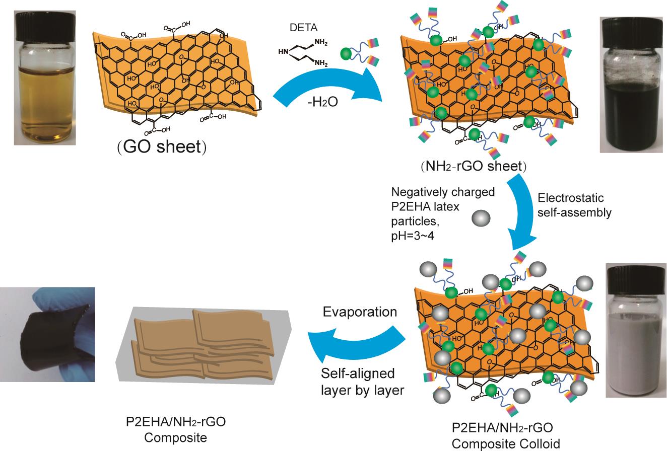图1二乙基三胺(DETA)同步氨基化还原氧化石墨烯以及其与带相反电性的乳液颗粒之间的静电自组装流程图。 |