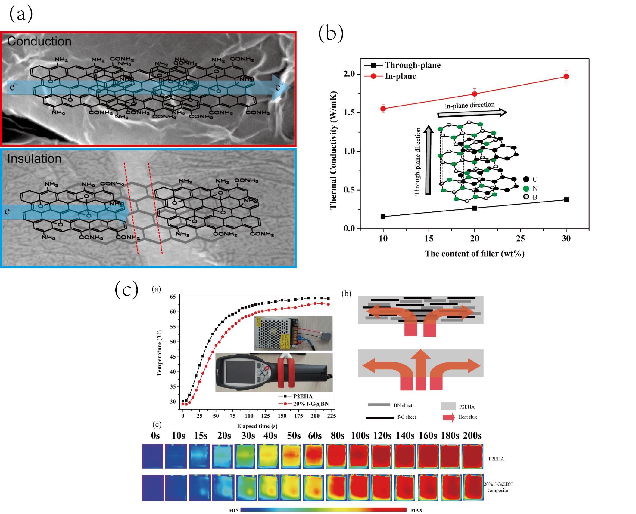 图2 (a)六方氮化硼@功能化石墨烯结构示意图;(b)复合材料导热性能示意图;(c)模拟复合材料在实际电子器件中的散热效果。
