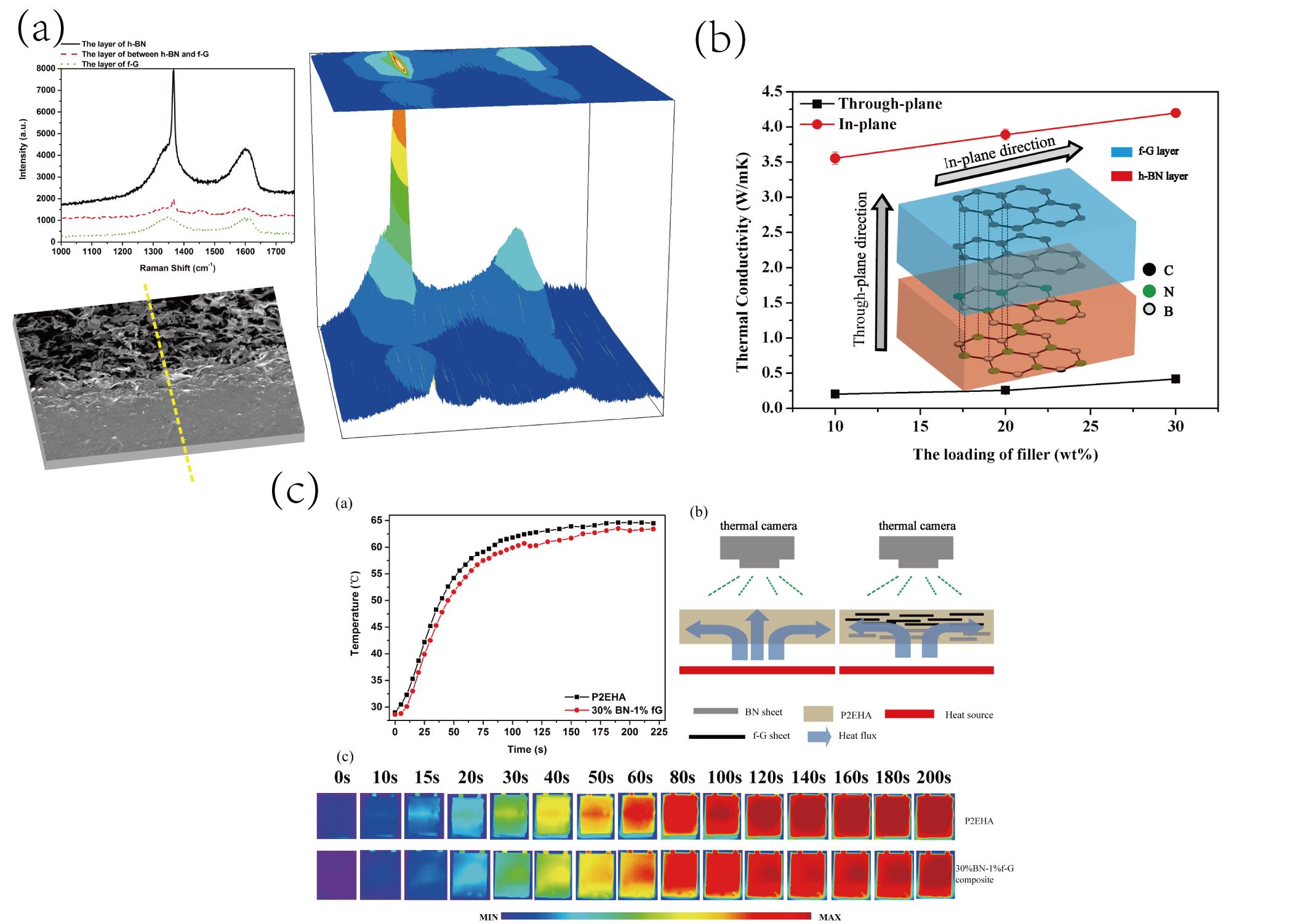 图3 (a)六方氮化硼和功能化石墨烯所形成的双层结构拉曼图;(b)复合材料导热性能示意图;(c)模拟复合材料在实际电子器件中的散热效果。