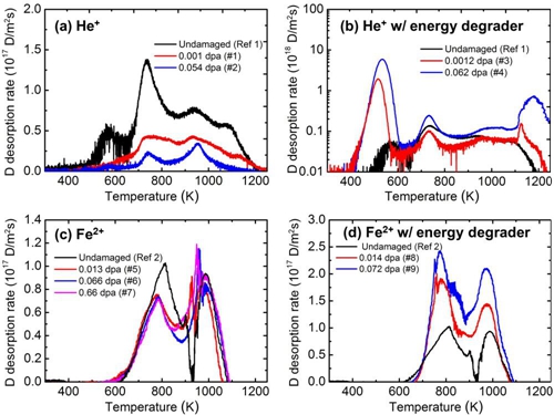 各种注入条件下的氘热脱附谱,本研究中,铁离子注入被用作对比实验
