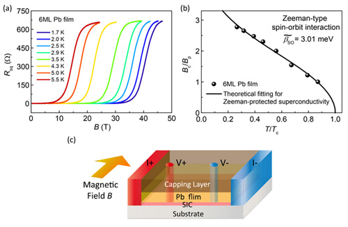 图 (a) 脉冲强磁场实验表明6个原子层厚铅膜的超导电性在高达40T的水平强场下仍不被破坏。(b) 临界场随温度的关系与理论高度重合,有力地证明了超薄铅膜中的塞曼自旋轨道耦合保护的超导电性。 (c) 对外延生长于条状非公度相(SIC)界面上的超薄铅膜进行磁阻测量的示意图。