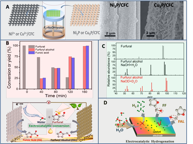 图(A)气相水热法合成金属磷化物示意图,与合成的Ni2P/CFC和Cu3P/CFC的扫描电镜图片;(B)两电极体系下糠醛电催化转化产物产量与反应物剩余量随时间变化,两电极体系下糠醛电催化转化示意图;(C)糠醛与产物糠醇的质谱图(D)电催化加氢与电催化析氢之间竞争关系示意图。