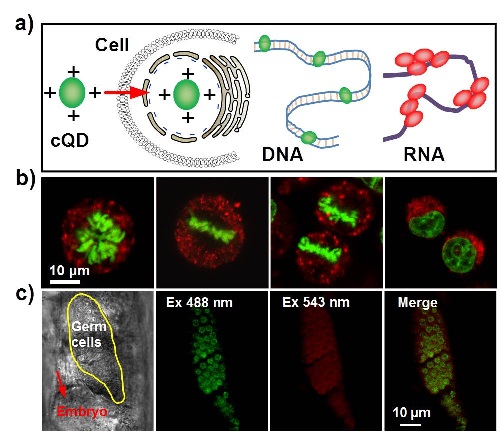 图:(a)碳点与细胞内DNA和RNA作用示意图。(b)碳点对细胞分裂过程中DNA和RNA动态变化的影像分析。(c)碳点对线虫体内生殖腺细胞DNA和RNA的同步成像。