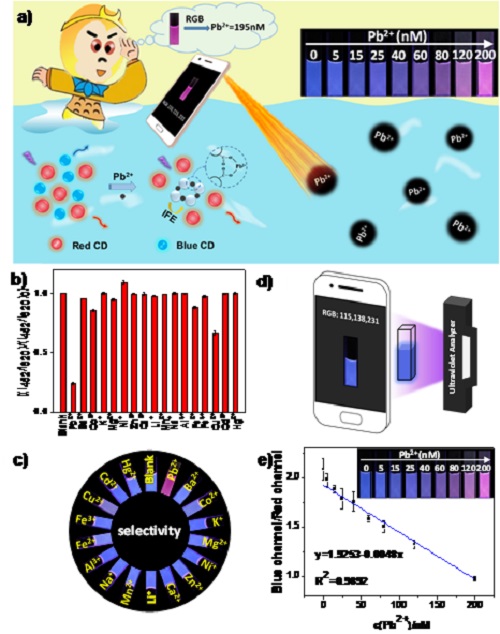 智能所研究人员开发了一种比率荧光探针检测水中铅离子的方法,并且利用荧光探针溶液打印的荧光试纸可以完成检测。该比率荧光探针由蓝色和红色碳点通过合适的比例混合得到,铅离子存在时蓝色碳点荧光被猝灭而红色碳点荧光不变,从而在紫外灯照射下观察到明显的由蓝到红的颜色变化。通过将试纸的颜色RGB值识别智能手机APP(颜色识别器)或者其他颜色识别卡等,即可实现铅离子的可视化、实时和半定量化检测。