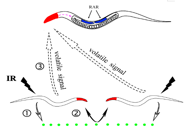 辐射旁效应是指受到直接辐照的细胞产生损伤信号诱导未辐照邻近细胞辐射反应的现象。辐射旁效应现象不仅局限于生物个体内部,也可以个体间通讯的方式在群体层面进行诱导。然而,以往的动物实验都是基于液体培养体系,辐射诱导的个体间通讯也被认为是水溶性信号分子介导的,到目前为止,还没有明确的证据证明挥发性信号分子在这个过程中的可能角色。