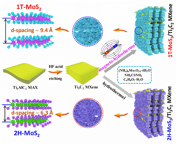 二维材料如过渡金属二硫化合物、MXene等由于具有丰富的物理和化学性能,使其在诸多领域如电化学领域有着潜在的应用前景。在前期工作中,针对1T相MoS2热力学亚稳态及无法长期稳定保存的难题,课题组采用强磁场水热法获得了高度稳定、纯1T相的MoS2 (ACS Nano 2019, 13, 1694-1702),并研究了导电性、层间距等对MoS2作为超级电容器电极材料的影响 ;成功获得了V4C3及Ti3C2 MXene并开展了这两种材料作为超级电容器电极方面的研究。在此工作基础上,课题组开展了强磁场下过渡金属二硫化合物1T-MoS2和MXene异质结构方面的相关研究。