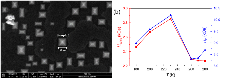 左图 钴铁氧纳米单晶的扫描电镜照片,右图 两个磁各向异性参数对温度的依赖关系。