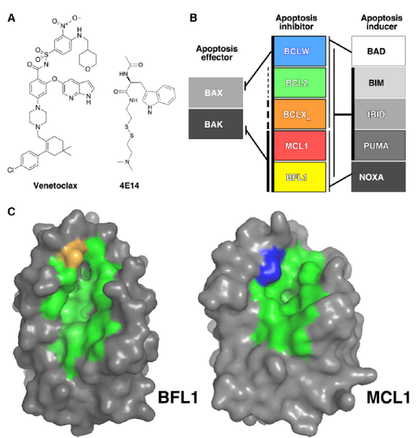 在同期杂志上,Harvey等研究人员发表了一篇题为“Identification of a Covalent Molecular Inhibitor of Anti-apoptotic BFL-1 by Disulfide Tethering”的文章,作者利用新型二硫键共价连接的方法,发现一种含巯基N-乙酰色氨酸类似物4E14能够共价结合在BFL1蛋白经典的BH3结合区域内,从而抑制BFL1的抗凋亡作用。因为其共价修饰机制,与其他的靶向药物相比,4E14对BFL1具有更好的选择性,因此,4E14将不仅为研究BFL1在调控细胞凋亡中的功能提供了新方法,也将为进一步筛选BFL1的小分子抑制剂奠定基础。