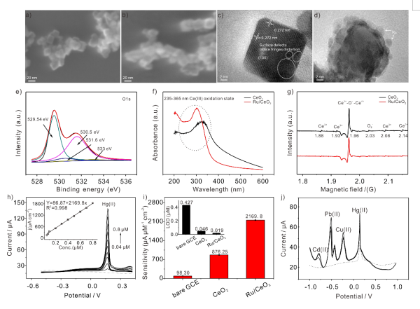 Ru/CeO2的结构表征与电分析行为研究。(a) CeO2(550℃)SEM图;(b) Ru/CeO2SEM图;(c) CeO2(550℃)TEM图;(d) Ru/CeO2TEM图;(e) CeO2(550℃)和Ru/CeO2的XPS图;(f) CeO2(550℃)和Ru/CeO2的UV-Vis图;(g) CeO2(550℃)和Ru/CeO2的EPR图谱;(h-j) Ru/CeO2敏感材料对Hg(II)的电化学检测研究。