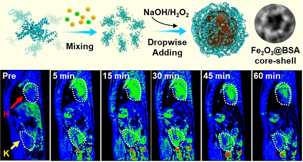 在该项研究中,研究者基于牛血清白蛋白(BSA)自组装形成的笼状蛋白结构调控磁性纳米材料尺寸,室温条件一步成功得到均匀的、单分散的、超小尺寸(3.5nm)的Fe2O3@BSA纳米颗粒,并确认了纳米颗粒表面笼状BSA超分子结构的存在。相比Gd-DPTA,该纳米颗粒的T1造影效果更好并且更持久,另外得益于BSA的包覆,该纳米颗粒在体内可以快速代谢经由尿液排出,具有很好的生物安全性,且制备方法简单高效未来极具商业前景。