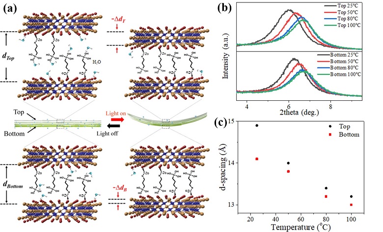 为了揭示和阐明该柔性薄膜的光驱动器原理,研究人员借助SHMFF变温XRD设备对该器件中的柔性光驱动薄膜材料的微观结构进行了研究。研究发现,该薄膜上表面和下表面的(002)衍射峰分别在5.9°和6.3°,表明该薄膜上下层的层间结构具有不对称性。实验发现,薄膜上下层都可以吸附水分子,但是上层吸附的水分子更多,其层间距更大【图1(a)】。对I-MXene薄膜的变温XRD研究表明,上下层的层间距都随着温度的升高而减小,这是由于温度的升高会导致插层中的水分子发生解吸附作用,但是上下层的解吸附作用的强度是不同的【图1(b)】。当温度从25℃升高到100℃,上层的层间距从14.9埃减少到13.2埃,而下层层间距从14.1埃减少到13.0埃【图1(c)】。上层的层间距变化比下层的大,并且上层在温度升高后所产生的变形比下层大。这些实验结果表明了上层具有更好的亲水性从而可以吸收更多的水分子。上下表面的层间距的不同造成上下表面对光照的机械响应不同,导致了薄膜在光照下曲率变化不同,从而造成光作用下的快速弯曲变形。