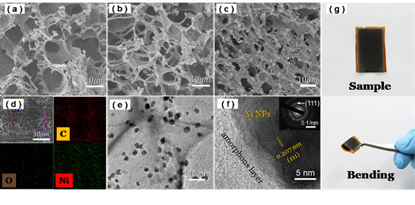 图2.(a-c)不同沉积时间D-LIG/Ni样品电镜图;(d)D-LIG/Ni样品元素mapping图;