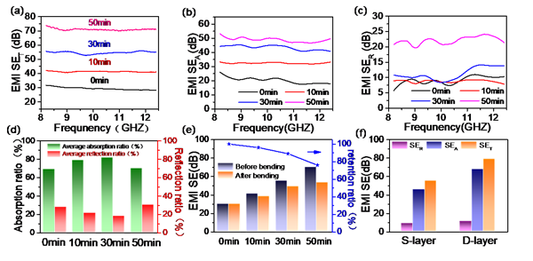 图3.(a-c)不同沉积时间D-LIG/Ni样品的SET、SEA、SER;(d)不同沉积时间D-LIG/Ni样品吸收率和反射率;(e)不同沉积时间D-LIG/Ni样品的弯曲稳定性;(f)单层和双层D-LIG/Ni样品的屏蔽效能。