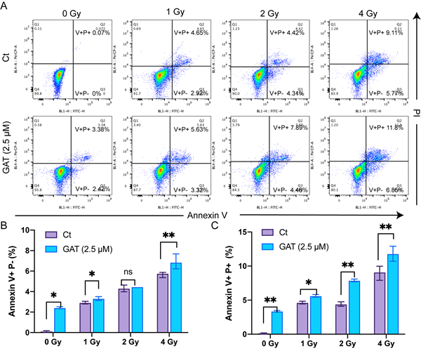 近年来,黄青课题组一直开展灵芝育种、功能开发和抗癌机理研究。本研究主要围绕灵芝酸T对癌细胞的辐射增敏作用机制进行,结果发现,灵芝酸T在γ辐射条件下不仅能诱导癌细胞凋亡,而且能诱导其程序性坏死,并随着灵芝酸T浓度的增加,细胞死亡状态会由凋亡逐渐转向程序性坏死。研究中,灵芝酸T可以增加辐射敏感性(图1),可以诱导细胞凋亡和坏死(图2)。