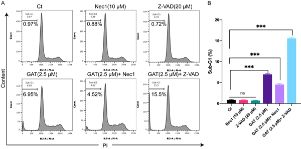 为了进一步区分到底是一般坏死还是程序性坏死,通过分析subG1(图3)和分别加入凋亡抑制剂(Z-VAD)和程序性坏死抑制剂(NEC1),证实灵芝酸T可以诱导细胞程序性坏死(图4)。进一步的研究发现,灵芝酸T增加DNA断裂损伤和ROS水平,降低线粒体膜电位,引发细胞周期阻滞和ATP耗竭,促使细胞死亡状态发生由细胞凋亡向程序性坏死的转变(图5)。